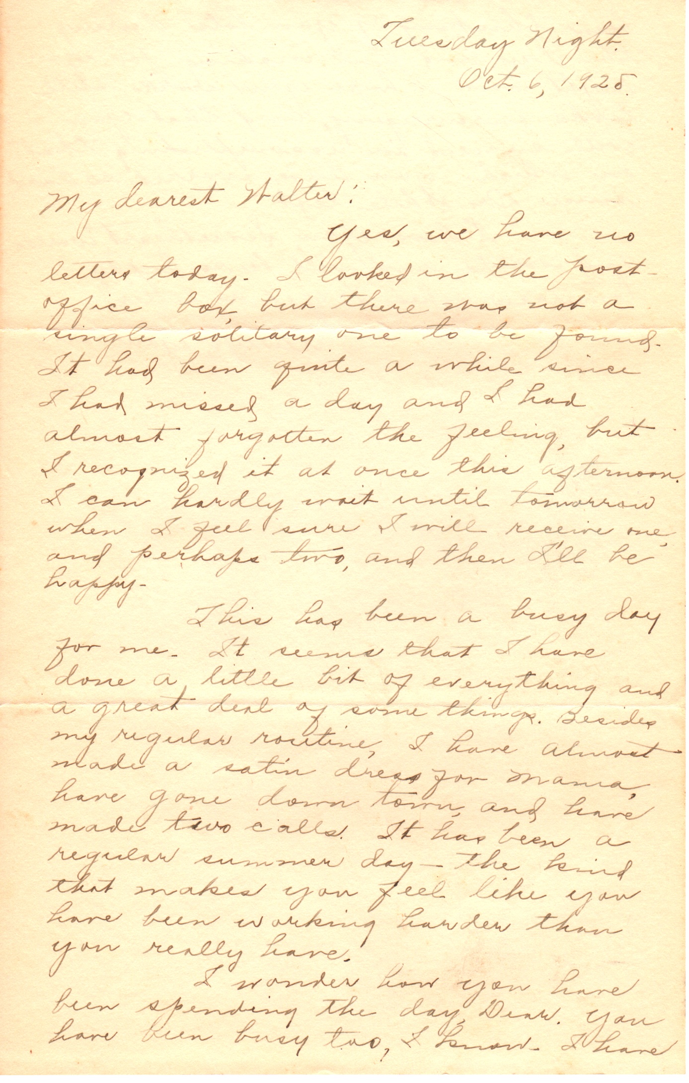 Yes, we have no letters today. I looked in the post office box, but there was not a single solitary one to be found. It had been quite a while since I had missed a day and I had almost forgotten the feeling, but I recognized it at once this afternoon. I can hardly wait until tomorrow when I feel sure I will receive one, and perhaps two, and then I’ll be happy.