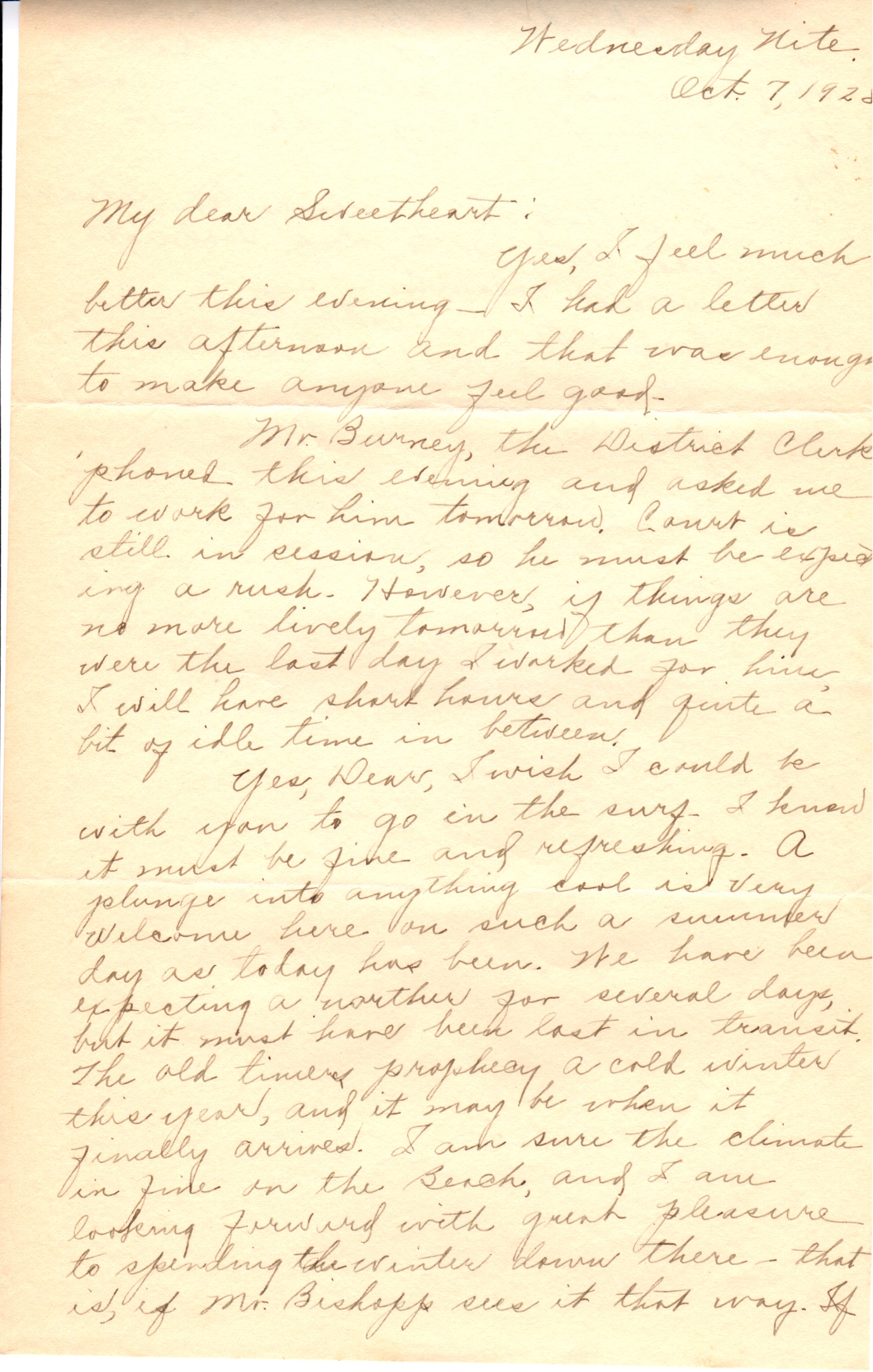 Yes, Dear, I wish I could be with you to go in the surf. I knew it must be fine and refreshing. A plunge into anything cool is very welcome here on such a summer day as today has been. We have been expecting a norther for several days, but it must have been lost in transit. The old timers prophecy a cold winter this year, and it may be when it finally arrives. I am sure the climate is fine on the Beach, and I am looking forward with great pleasure to spending the winter down there – that is, if Mr. Bishopp sees it that way. If we can’t spend it there, we can spend it somewhere else. The part that concerns and pleases me most is that we are going to spend it together.