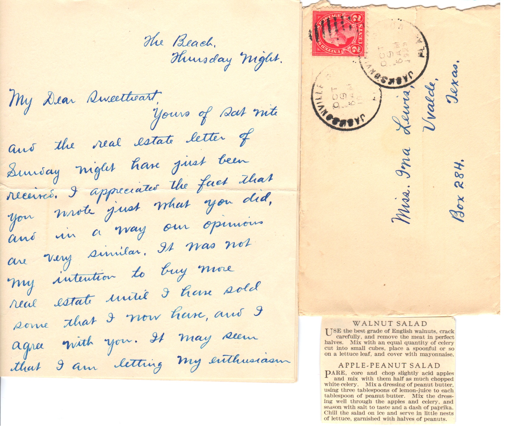 The Florida boom has been affecting Jacksonville only about one year, but it is the largest and most substantial city in the state and there is every reason to believe that it will be permanent growth. New industries are coming. Its location as the distributing point for the state and as an export city give it a distinct advantage. When I consider that its population was the same as Dallas in 1913, I can visualize a normal growth which would equal that of Dallas in the same length of time. But it is developing more rapidly, and without going into a lengthy discussion of it, I will let you judge for yourself when you come down. In the meantime you can rest assured that my next activity in real estate will be to sell.