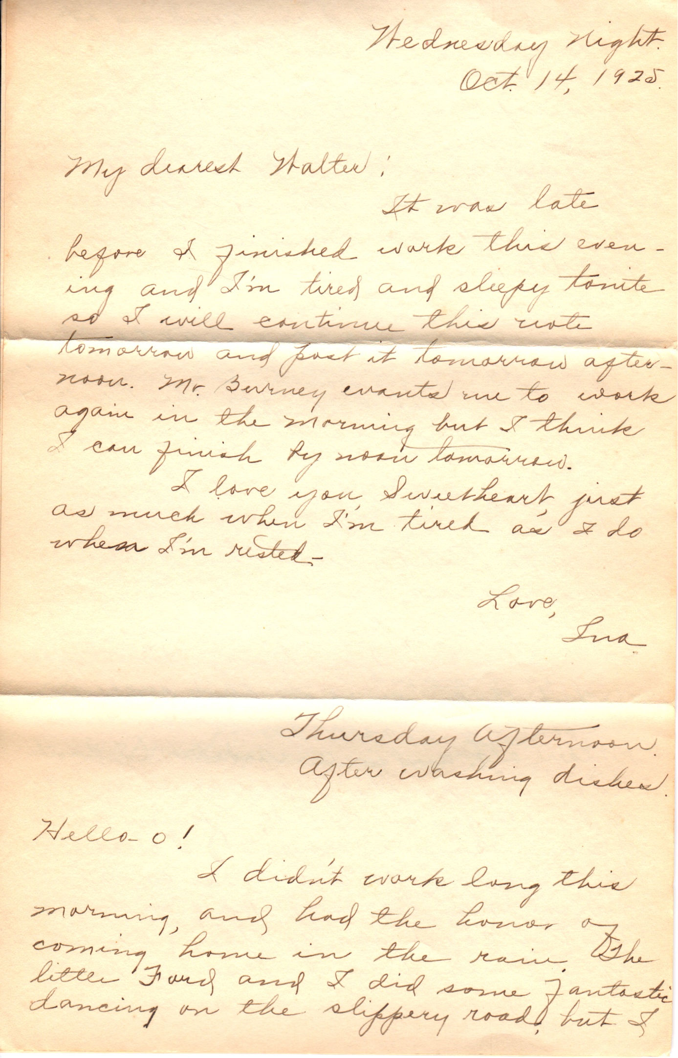 I didn’t work long this morning, and had the honor of coming home in the rain. The little Ford and I did some fantastic dancing on the slippery road, but I finally succeeded in guiding it safely home. It was quite a task at times when I was not a successful mind reader. How did I know when it was going to suddenly jerk around to the left or right like a person turning clear around to see who is coming? I didn’t get ditched though, all for which I am duly grateful.