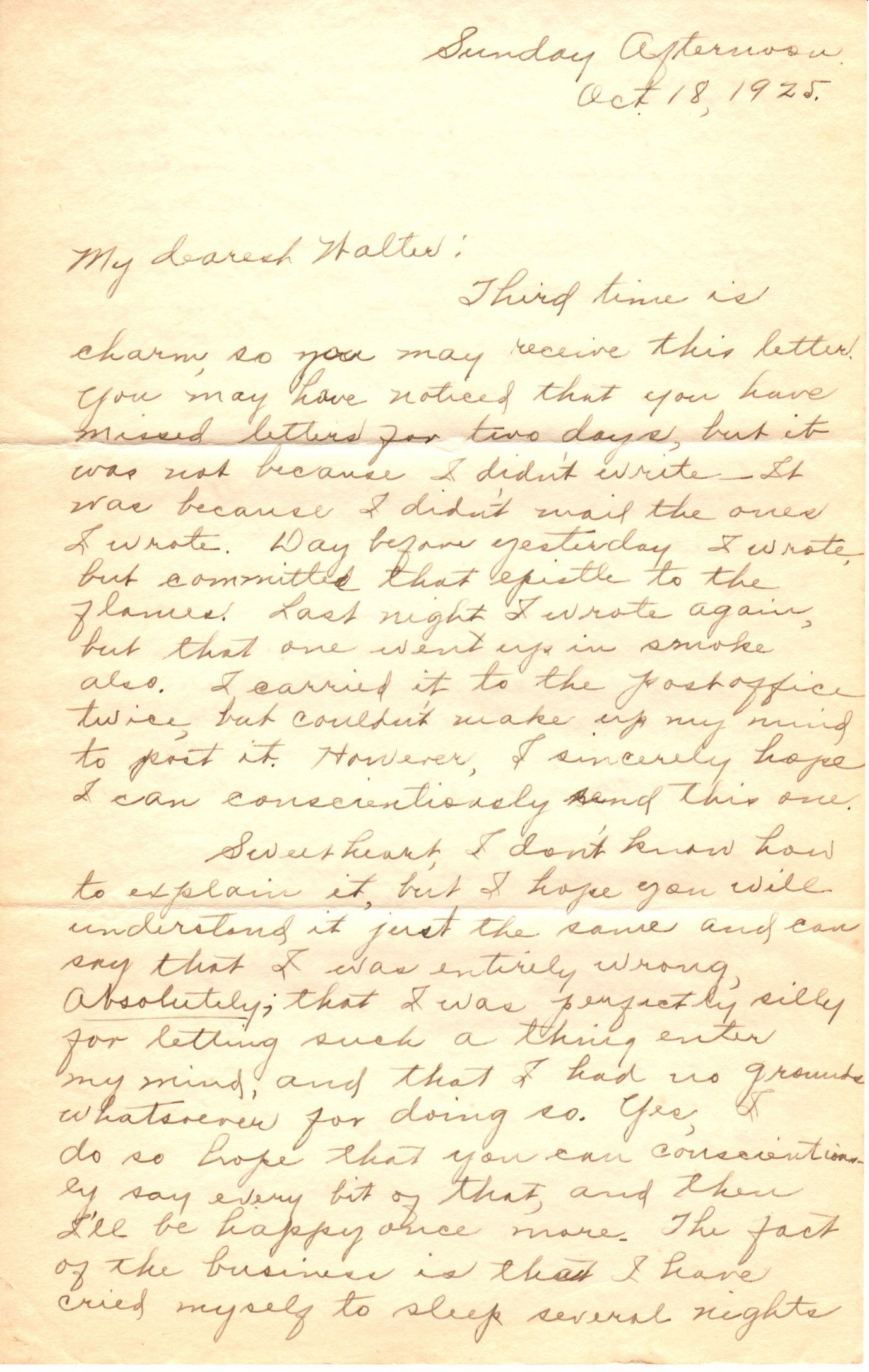 Third time is charm, so you may receive this letter. You may have noticed that you have missed letters for two days, but it was not because I didn’t write – it was because I didn’t mail the ones I wrote. Day before yesterday I wrote, but committed that epistle to the flames. Last night I wrote again, but that one went up in smoke also. I carried it to the post office twice, but couldn’t make up my mind to post it. However, I sincerely hope I can conscientiously send this one.