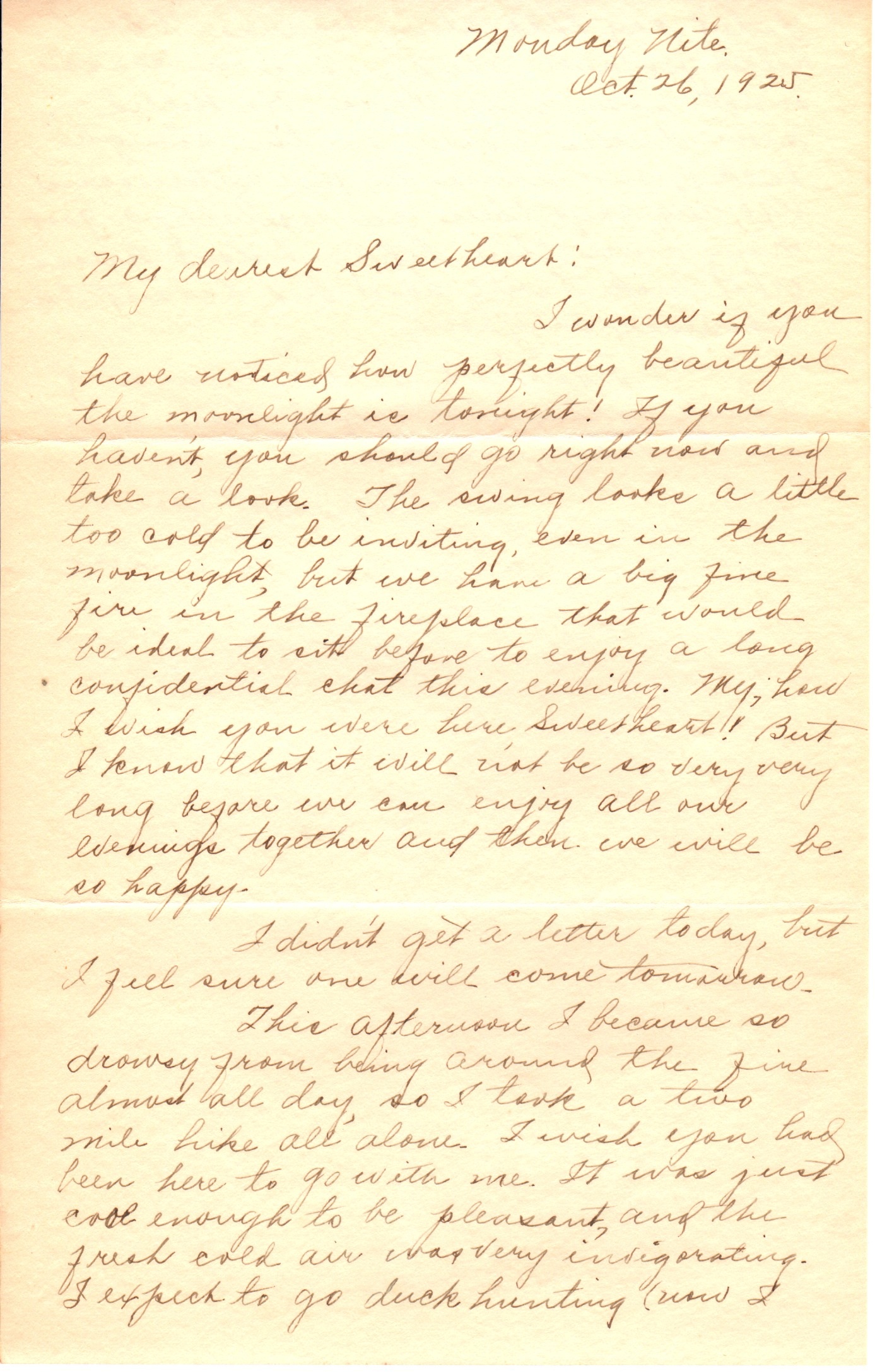 I wonder if you have noticed how perfectly beautiful the moonlight is tonight! If you haven’t, you should go right now and take a look. The swing looks a little too cold to be inviting, even in the moonlight, but we have a big fine fire in the fireplace that would be ideal to sit before to enjoy a long confidential chat this evening. My, how I wish you were here, Sweetheart! But I know that it will not be so very very long before we can enjoy all our evenings together and then we will be so happy.