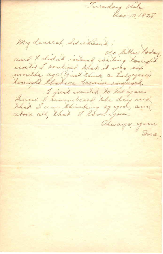 No letter today, and I didn’t intend writing tonight until I realized that it was six months ago (just think, a half year) tonight that we became engaged.