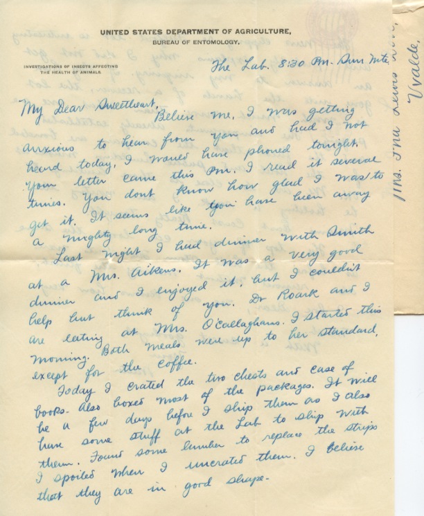 Last night I had dinner with Smith at a Mrs. Aikens. It was a very good dinner and I enjoyed it, but I couldn’t help but think of you. Dr. Roark and I are eating at Mrs. O’Callaghan’s. I started this morning. Both meals were up to her standard, except for the coffee.