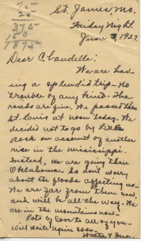 We are having a splendid trip – no trouble of any kind. The roads are fine. We passed through St. Louis at noon today. We decided not to go by Little Rock on account of another rise in the Mississippi. Instead, we are going through Oklahoma. So don’t worry about the floods affecting us. We are far from them now, and will be all the way. We are in the mountains now.