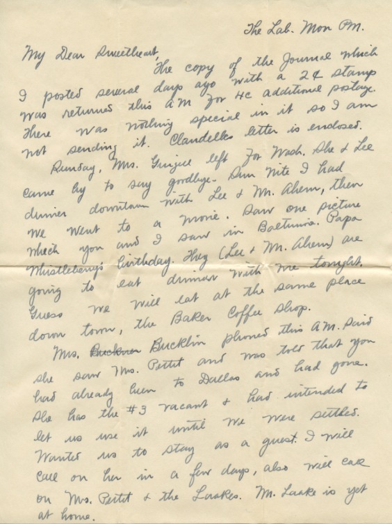Sunday, Mrs. Gingell left for Wash. She & Lee came by to say goodbye. Sun nite I had dinner downtown with Lee & Mr. Ahern, then we went to a movie. Saw one picture which you and I saw in Baltimore. Papa Whistleberry’s birthday. They (Lee & Mr. Ahern) are going to eat dinner with me tonight. Guess we will eat at the same place down town, the Baker Coffee Shop.