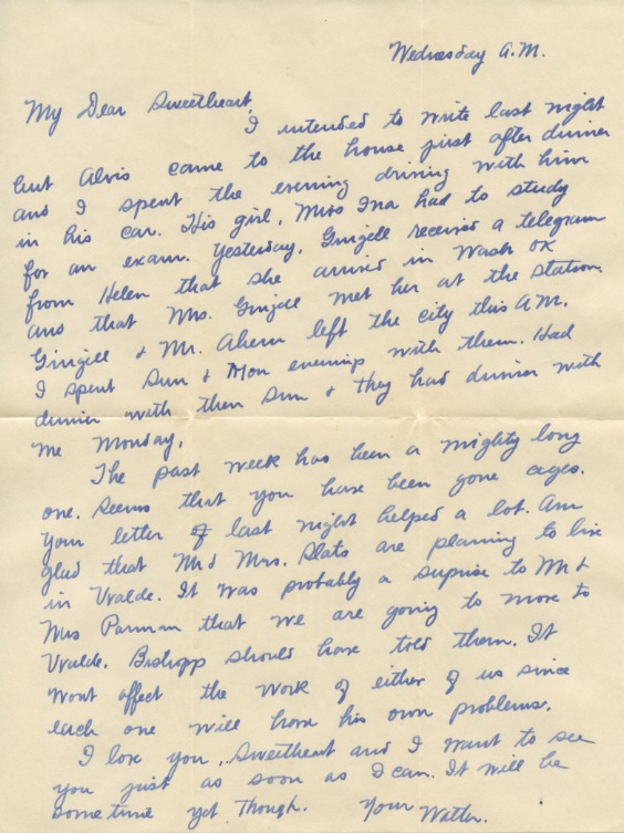 The past week has been a mighty long one. Seems that you have been gone ages. Your letter of last night helped a lot. Am glad that Mr. & Mrs. Slats are planning to live in Uvalde. It was probably a surprise to Mr. & Mrs. Parman that we are going to move to Uvalde. Bishopp should have told them. It won’t affect the work of either of us since each one will have his own problems.