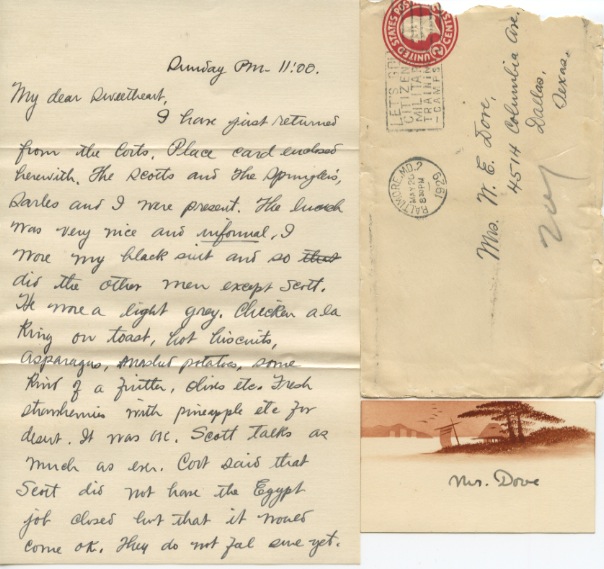 I have just returned from the Corts. Place card enclosed herewith. The Scotts and the Springlers, Sarles and I were present. The lunch was very nice and informal. I wore my black suit and so did the other men except Scott. He wore a light grey. Chicken a la King on toast, hot biscuits, asparagus, mashed potatoes, some kind of a fritter, olives etc. Fresh strawberries with pineapple etc. for dessert. It was OK. Scott talks as much as ever. Cort said that Scott did not have the Egypt job closed but that it would come OK. They do not feel sure yet.