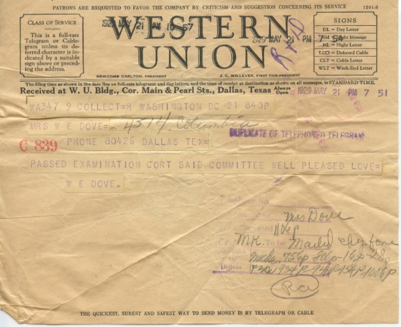 May 21, 1929 Western Union – Received at W.U. Bldg., Cor. Main & Pearl Sts., Dallas, Texas – 1929 May 21 PM 7 51 MRS W E DOVE PHONE 80426 DALLAS TEX PASSED EXAMINATION CORT SAID COMMITTEE WELL PLEASED LOVE W E DOVE. May 21, 1929