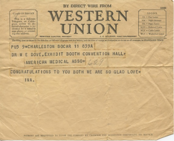 I can’t decipher a date on this telegram, but it’s probably from late 1929, when Walter and Dr. White received an award from the American Medical Association for their work on larva migrans.