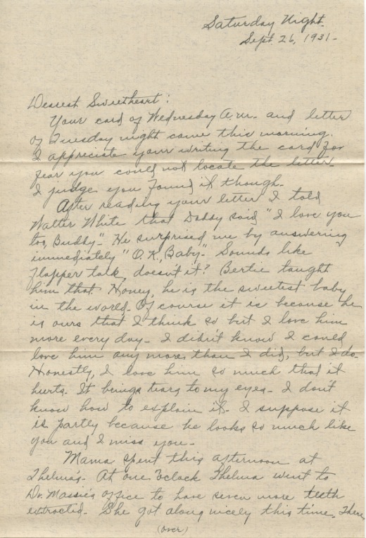 After reading your letter I told Walter White that Daddy said “I love you too, Buddy.” He surprised me by answering immediately “O.K., Baby.” Sounds like flapper talk, doesn’t it? Bertie taught him that. Honey, he is the sweetest baby in the world. Of course it is because he is ours that I think so but I love him more every day. I didn’t know I could love him any more than I did, but I do. Honestly, I love him so much that it hurts. It brings tears to my eyes. I don’t know how to explain it. I suppose it is partly because he looks so much like you and I miss you.