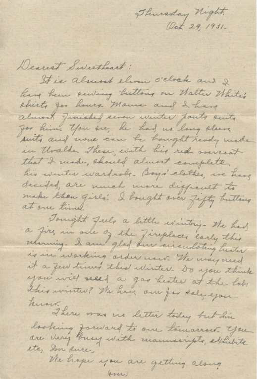 It is almost eleven o’clock and I have been sewing buttons on Walter White’s shirts for hours. Mama and I have almost finished seven winter pants suits for him. You see, he had no long sleeve suits and none can be bought ready made in Uvalde. These, with his red overcoat that I made, should almost complete his winter wardrobe. Boys’ clothes, we have decided, are much more difficult to make than girls’. I bought over fifty buttons at one time.
