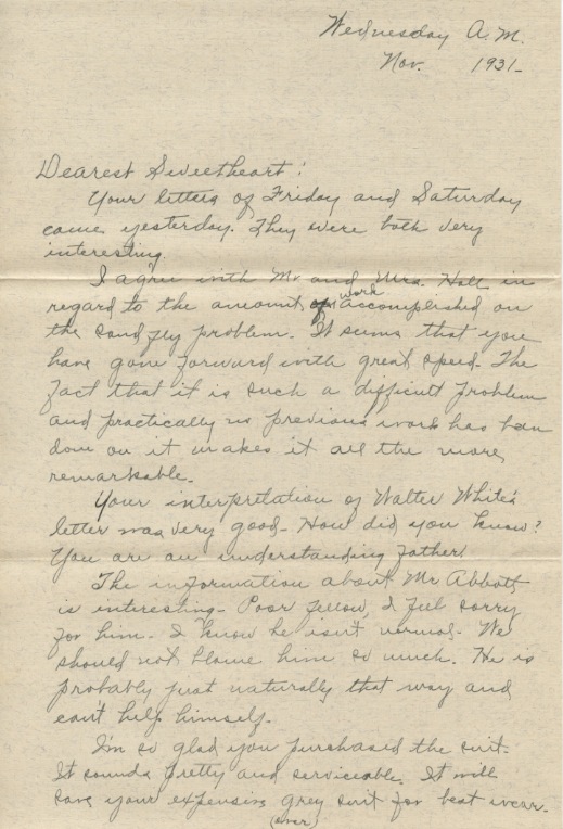 I’m so glad you purchased the suit. It sounds pretty and serviceable. It will save your expensive gray suit for best wear. You needed one to wear to the lab. That clothing store will be a blessing to the town if the merchandise is as good as it seems. It was mighty sweet of you to think of purchasing one for Papa’s Xmas gift. I told Mama about it and she said they would not let you do such a thing. Papa said the same when she told him. They appreciate it very much, and so do I, but they do not want you to spend that much on his gift. He still has his blue serge suit that he wore in our wedding and it looks like new.
