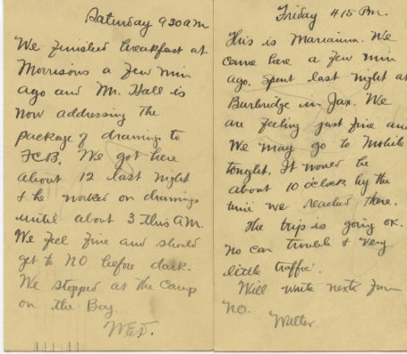 We finished breakfast at Morrisons a few min. ago and Mr. Hall is now addressing hte package of drawings to FCB. We got here about 12 last night & he worked the drawings until about 3 this AM. We feel fine and should get to NO before dark. We stopped at the Camp on the Bay.