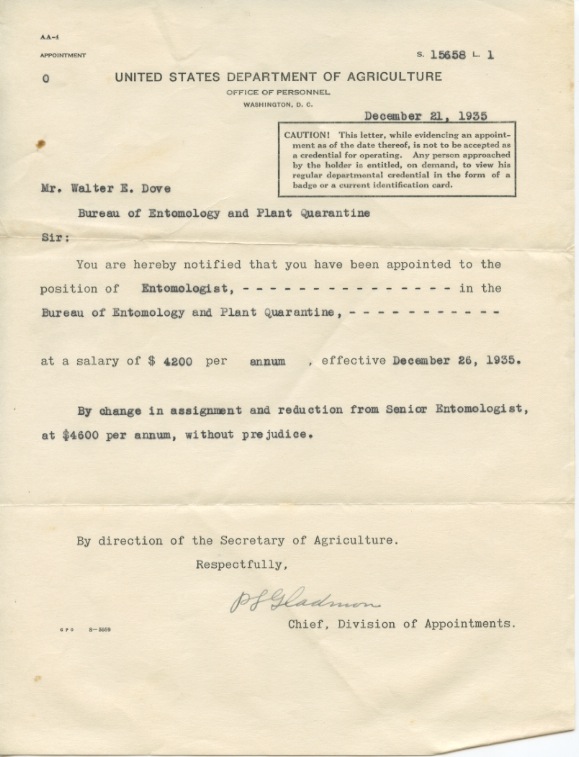 December 21, 1935 From the USDA personnel office. December 21, 1935 Walter got a demotion, probably due to budget cuts. This equals a pay reduction of about $6,700 in today’s money.