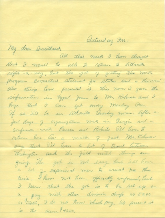 All this week I have thought that I would be able to return to Atlanta right-a-way, but the job of getting the work program cooperative statement for states and a thousand other things have prevented it. This noon I gave the information in typed form to Mr. Rohner and I hope that I can get away Monday PM. If so, I’ll be in Atlanta Tuesday noon. After a few days of organization work in Georgia and a conference with Bruce and Roberts I’ll have to return here. As a matter of fact, Mr. Rohner says that I’ll have a lot of travel between Washington and the field until things are going. The job is not easy but I’ll have a lot of experienced men to assist me this time. I have not been officially informed, but I learn that the job is to be set up on a pay with other division chiefs at $5200 or $5600, I do not know which pay. At present it is the same $4200.