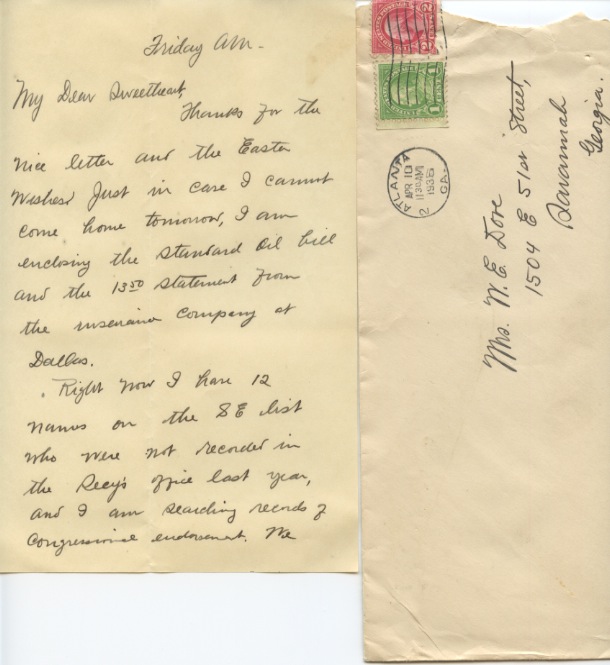 Thanks for the nice letter and the Easter wishes. Just in case I cannot come home tomorrow, I am enclosing the Standard Oil bill and the 13.50 statement from the insurance company at Dallas.