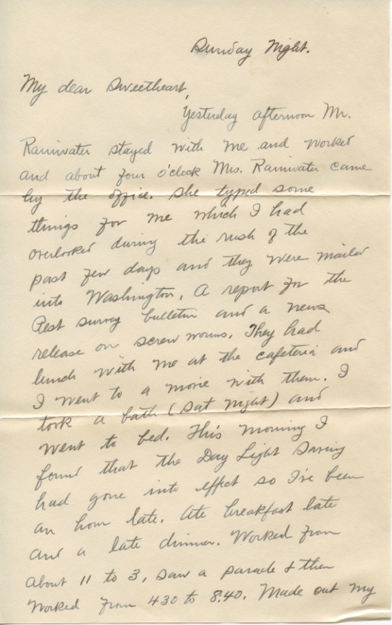 Yesterday afternoon Mr. Rainwater stayed with me and worked and about four o’clock Mrs. Rainwater came by the office. She typed some things for me which I had overlooked during the rush of the past few days and they were mailed into Washington. A report for the Pest survey bulletin and a news release on screw worms. They had lunch with me at the cafeteria and I went to a movie with them. I took a bath (Sat. night) and went to bed. This morning I found that the Day Light Saving had gone into effect so I’ve been an hour late. Ate breakfast late and a late dinner. Worked from about 11 to 3, saw a parade & then worked from 4:30 to 8:40. Made out my accounts for March and April so that Mitchell can type them tomorrow. I do not get expenses at Atlanta. With the visiting period on the Cushings my accounts amount to $99.