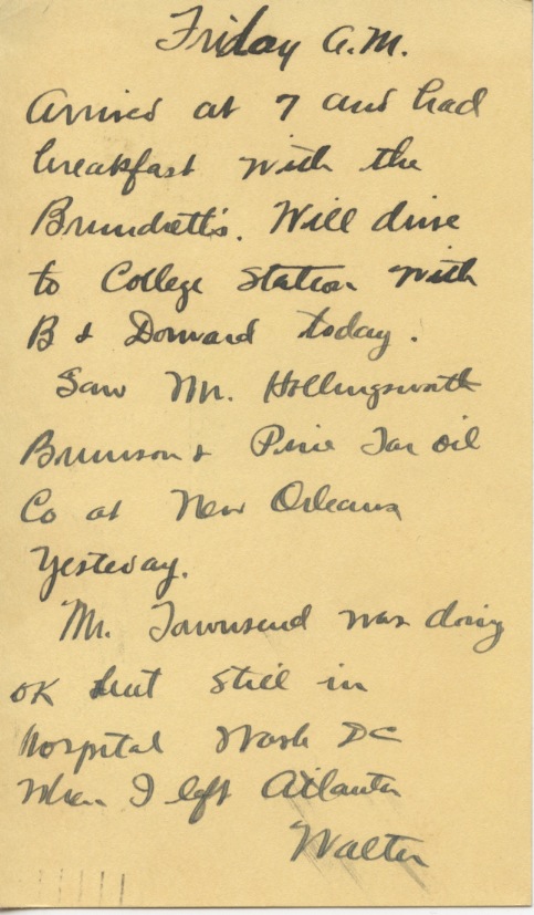 Arrived at 7 and had breakfast with the Brundretts. Will drive to College Station with B. & Doward today.