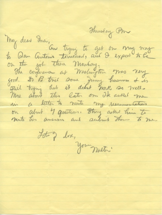 The conference at Washington was very good. Dr. B. tried some funny business & is still trying but it didn’t work so well. More about this later on. He asked me in a letter to write my recommendations on about 7 questions. Strong asked him to write his answers and submit them to me.