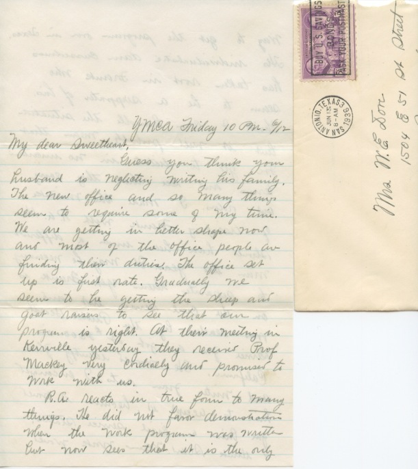 Guess you think your husband is neglecting writing his family. The new office and so many things seem to require some of my time. We are getting in better shape now and most of the office people are finding their duties. The office set up is first rate. Gradually we seem to be getting the sheep and goat raisers to see that our program is right. At their meeting in Kerrville yesterday they received Prof. Mackey very cordially and promised to work with us.