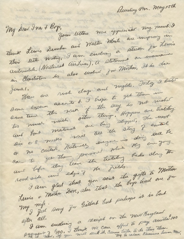 These are rush days and nights. Today I listed some expense accounts & I hope to get them in some time this week if the sec’y is not rushed too much with other things. Hoppers are hatching and bait materials are being shipped. The next six or 8 weeks will tell the story of control or no control. Naturally everyone is doing all he can to get them poisoned while they are young and before they leave the hatching beds along the roadsides and edges of the fields.