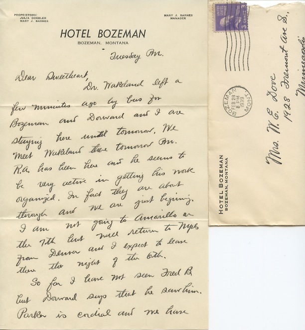 Dr. Wakeland left a few minutes ago by bus for Bozeman and Dorward and I are staying here until tomorrow. We meet Wakeland there tomorrow PM. R.A. has been here and he seems to be very active in getting his work organized. In fact they are about through and we are just beginning. I am not going to Amarillo on the 7th but will return to Mpls from Denver and I expect to leave there the night of the 6th.