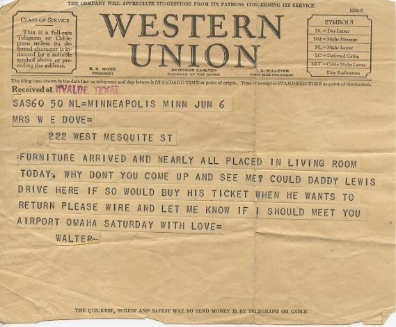 Western Union telegram, received at Uvalde, TX.