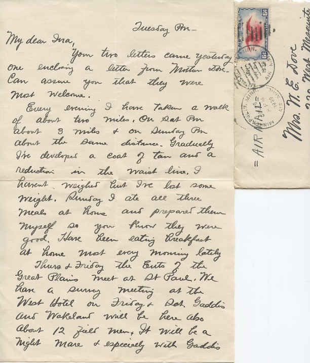 Every evening I have taken a walk of about two miles. On Sat. PM about 3 miles & on Sunday PM about the same distance. Gradually I’ve developed a coat of tan and a reduction in the waist line. I haven’t weighed but I’ve lost some weight. Sunday I ate all three meals at home and prepared them myself so you know they were good. Have been eating breakfast at home most every morning lately.