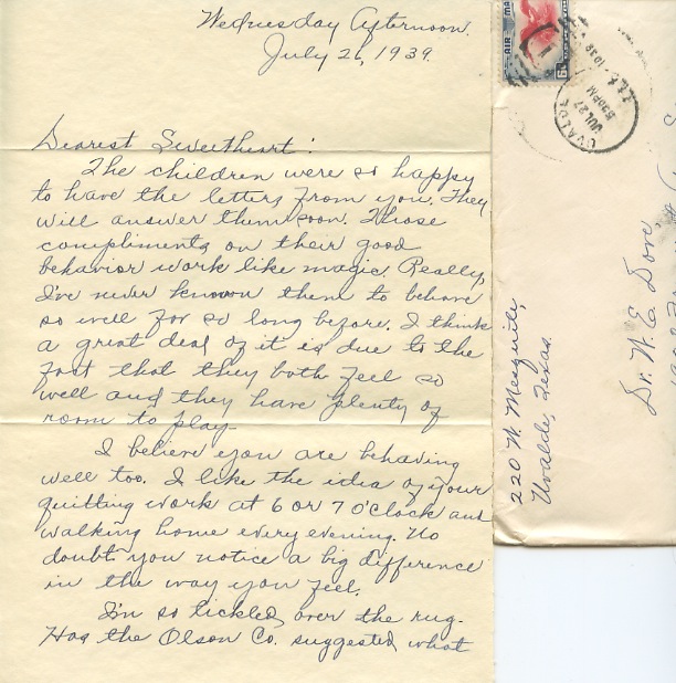 Perhaps you don’t like this high-handed way in which we are planning the trip to Mississippi, but I had to admit to Mother Dove that the children and I were hoping we could go after I learned that someone, perhaps you, had written her that we were going. I’m anxious to hear from you about it. I shall not answer the enclosed letter until I hear from you. If you want to go by Ethel’s after we go to Mother Dove’s it suits us fine.
