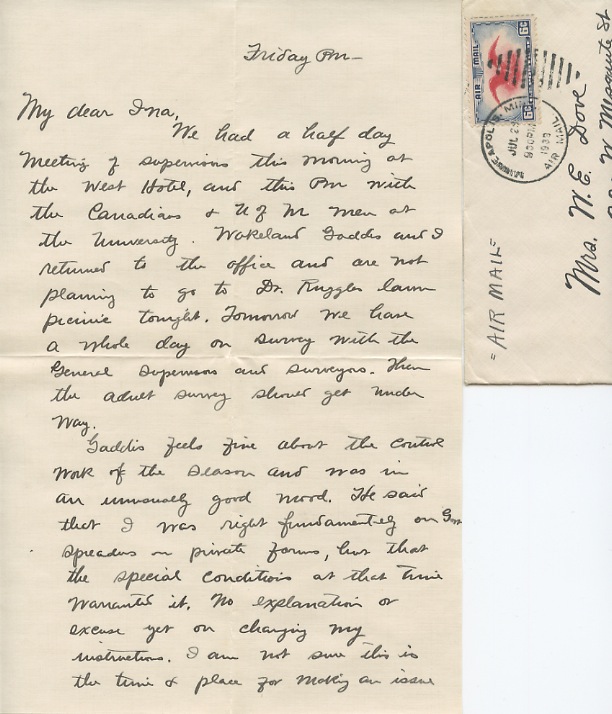We had a half day meeting of supervisors this morning at the West Hotel, and this PM with the Canadians & U of M men at the University. Wakeland Gaddis and I returned to the office and are not planning to go to Dr. Ruggles lawn picnic tonight. Tomorrow we have a whole day on survey with the General Supervisors and surveyors. Then the adult survey should get under way.