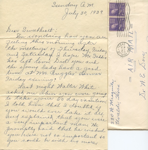 The children and I are eating dinner at Thelma’s and Bob’s today. Reitha has gone horseback riding with one of her male admirers this morning. The joy of being at home has not worn off for her yet. She is so fond of her little baby brother; she bathes and dresses him several times a day, and takes him around to show him to everyone who hasn’t seen him yet; she even takes him along when her boyfriends come by for a ride in the daytime. She was eighteen yesterday. A few afternoons ago she went with us to Shut-in at Con Can for a swim. She was by far the most attractive girl on the beach; she wore the white bathing suit you and I gave her for graduation. Walter White, Ina Marie, and Lewis Dunbar went in too, but Thelma, little Dolph, and I stayed out and watched them. How much would I give if I didn’t go through such agony of fear when our children are in the water! Reitha is a good swimmer, but I doubt if she could rescue big, heavy Walter White if he were to step off in a hole. I realize, though, that he can’t learn to swim on dry land or even in very shallow water. Lewis Dunbar ventures in only far enough to wet his ankles.