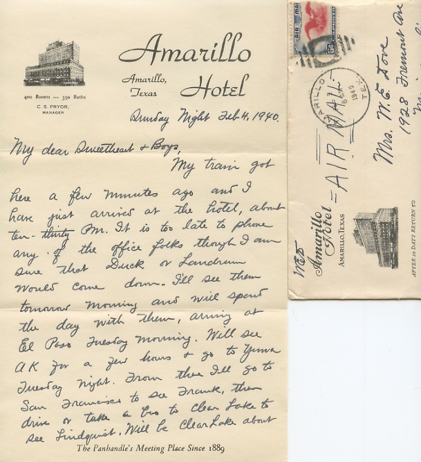 Stationery from the Amarillo Hotel, Amarillo, TX, “The Panhandle’s Meeting Place Since 1889.”