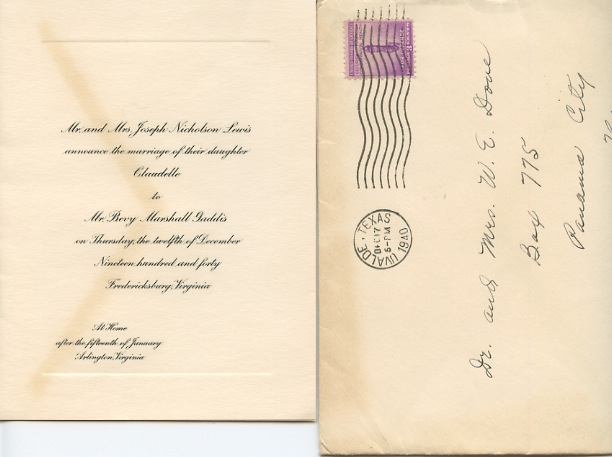 Mr. and Mrs. Joseph Nicholson Lewis announce the marriage of their daughter Claudelle to Mr. Bevy Marshall Gaddis on Thursday, the twelfth of December Nineteen hundred and forty.