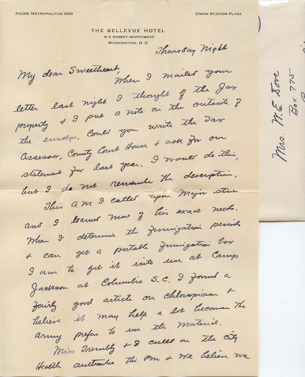 This AM I called upon Major Stone and I learned more of his exact needs. When I determine the fumigation periods & can get a portable fumigation box I am to get it into use at Camp Jackson at Columbia S.C. I found a fairly good article on chloropicrin & believe it may help a lot because the Army prefers to use this material.