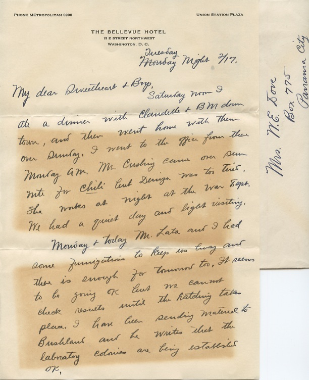 Saturday noon I ate a dinner with Claudelle & BM down town, and then went home with them over Sunday. I went to the office from there Monday AM. Mr. Cushing came over Sun. night for chili but Deniza was too tired. She works at night at the War Dept. We had a quiet day and light visiting.