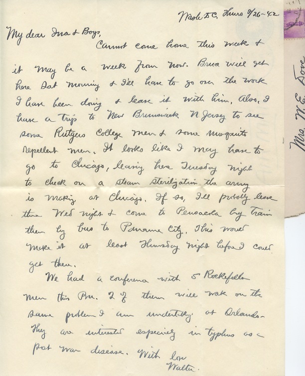 Cannot come home this week & it may be a week from now. Bruce will get here Sat. morning & I’ll have to go over the work I have been doing & leave it with him. Also, I have a trip to New Brunswick N Jersey to see some Rutgers College men & some mosquito repellent men. It looks like I may have to go to Chicago, leaving here Tuesday night to check on a steam sterilization the Army is making at Chicago. If so, I’ll probably leave there Wed. night & come to Pensacola by train then by bus to Panama City. This would make it at least Thursday night before I could get there.