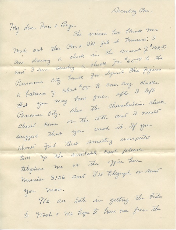 The income tax blank was made out this PM & I’ll file it tomorrow. I am drawing a check in the amount of $192.51 and I am sending a check for $65.58 to the Panama City bank for deposit. This figures a balance of about $55 to cover any checks that you may have given after I left Panama City. Also the Chamberlain check should come on the 15th and I would suggest that you cash it. If you should find that something unexpected took up the available cash please telephone me at the office here number 3106 and I’ll telegraph or send you more.