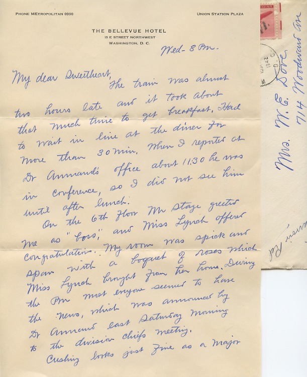 Cushing looks just fine as a Major and he joined me in a conference with Dr. Annand. This had to do with Army & Bureau services, also use of other entomologists in the Army. Saw Rohner and Hoyt in the hall and they were most cordial. Dr. B. came in at 5:30 and welcomed me to the city. This was in the presence of Claudelle. Claudelle and I ate dinner together and she went to Clarendon on a bus. She had parked her car there. Tomorrow she is going to drive in and I will go out there tomorrow night. She is helping find me a house for us, but has no encouragement so far. She asks if we want to buy a place. I’ll see Cushings, but I understand from C. that Deniza wants $100 per month for her place furnished. They can sell OK if they want to. Annand is building a new home and his may be available. I may inquire about it.