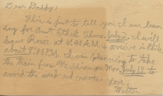 This is just to tell you I am leaving for Aunt Ethel’s Thurs. July 2. I will leave Roxie at 6:40 A.M. & arrive in Phila. about 8:00 P.M. I am planning to take the train from Meridian on Mon., July 13 to avoid the week-end crowds.