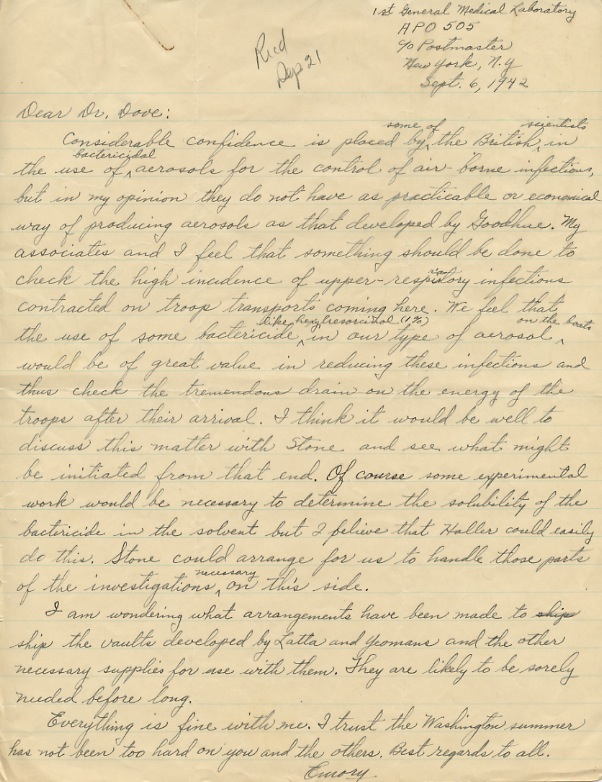 Considerable confidence is placed by some of the British scientists in the use of bactericidal aerosols for the control of air-borne infections, but in my opinion they do not have as practicable or economical way of producing aerosols as that developed by Goodhue. My associates and I feel that something should be done to check the high incidence of upper-respiratory infections contracted on troop transports coming here. We feel that the use of some bactericide like hexylresorcinol (1%) in our type of aerosol on the boats would be of great value in reducing these infections and thus check the tremendous drain on the energy of the troops after their arrival. I think it would be well to discuss this matter with Stone and see what might be initiated from that end. Of course some experimental work would be necessary to determine the solubility of the bactericide in the solvent but I believe that Haller could easily do this. Stone could arrange for us to handle those parts of the investigation necessary on this side.