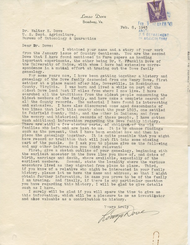 An article in the January 1943 issue of The Country Gentleman magazine featured Walter’s work on insect control and its importance in the war effort. After the piece came out a number of people contacted him. This inquiry is from a genealogist researching Dove ancestry.