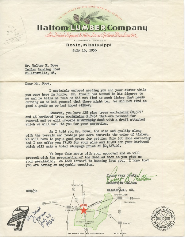 After inheriting the Dove family farm in Mississippi, Walter and his sister started managing it. This letter marks the beginning of tree harvesting on the place. Walter’s three sons eventually turned the entire property – just over 700 acres – into a sustainable tree farm for lumber and pulp. It still operates that way today.