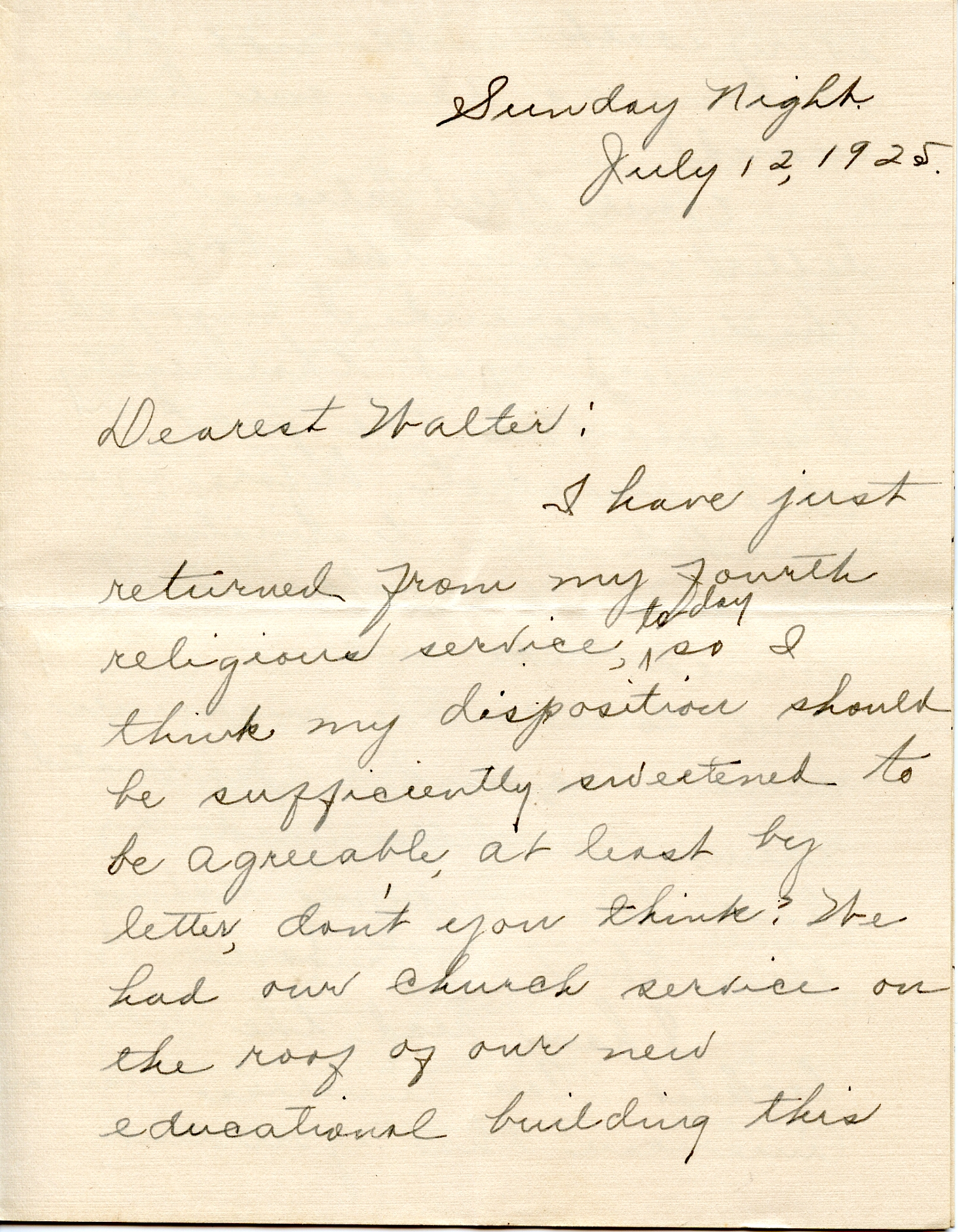 I have just returned from my fourth religious service today, so I think my disposition should be sufficiently sweetened to be agreeable, at least by letter, don’t you think? We had our church service on the roof of our new educational building this evening, and, due to the fact that we had a nice shower this afternoon it was so cool that a light wrap was very comfortable. Mr. Schofield, rector of the Episcopal church here, preached a very interesting sermon, and that, together with the cool breezes etc., made everyone enjoy the service very much. It would have been much more pleasant for me tho if you had been there right by the side of me. Just a week ago you left Uvalde but really it seems like months to me. I sincerely hope that every week will not be as long as this one has seemed.