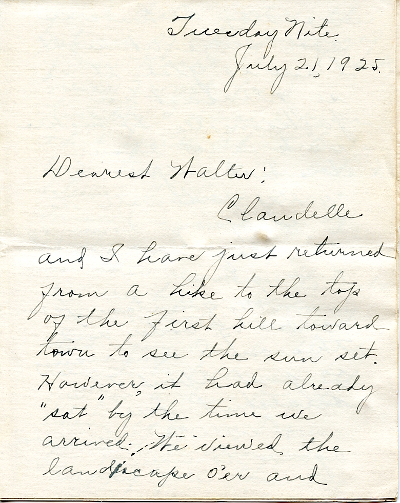 Claudelle and I have just returned from a hike to the top of the first hill toward town to see the sun set. However, it had already “sat” by the time we arrived. We viewed the landscape o’er and pronounced it very beautiful in spite of the absence of the solar illumination. Since it is Tuesday evening we could also see the fiery cross. We ran a race down the hill, but, thanks to the tight skirts, we were sufficiently hobbled to avoid being arrested for speeding.