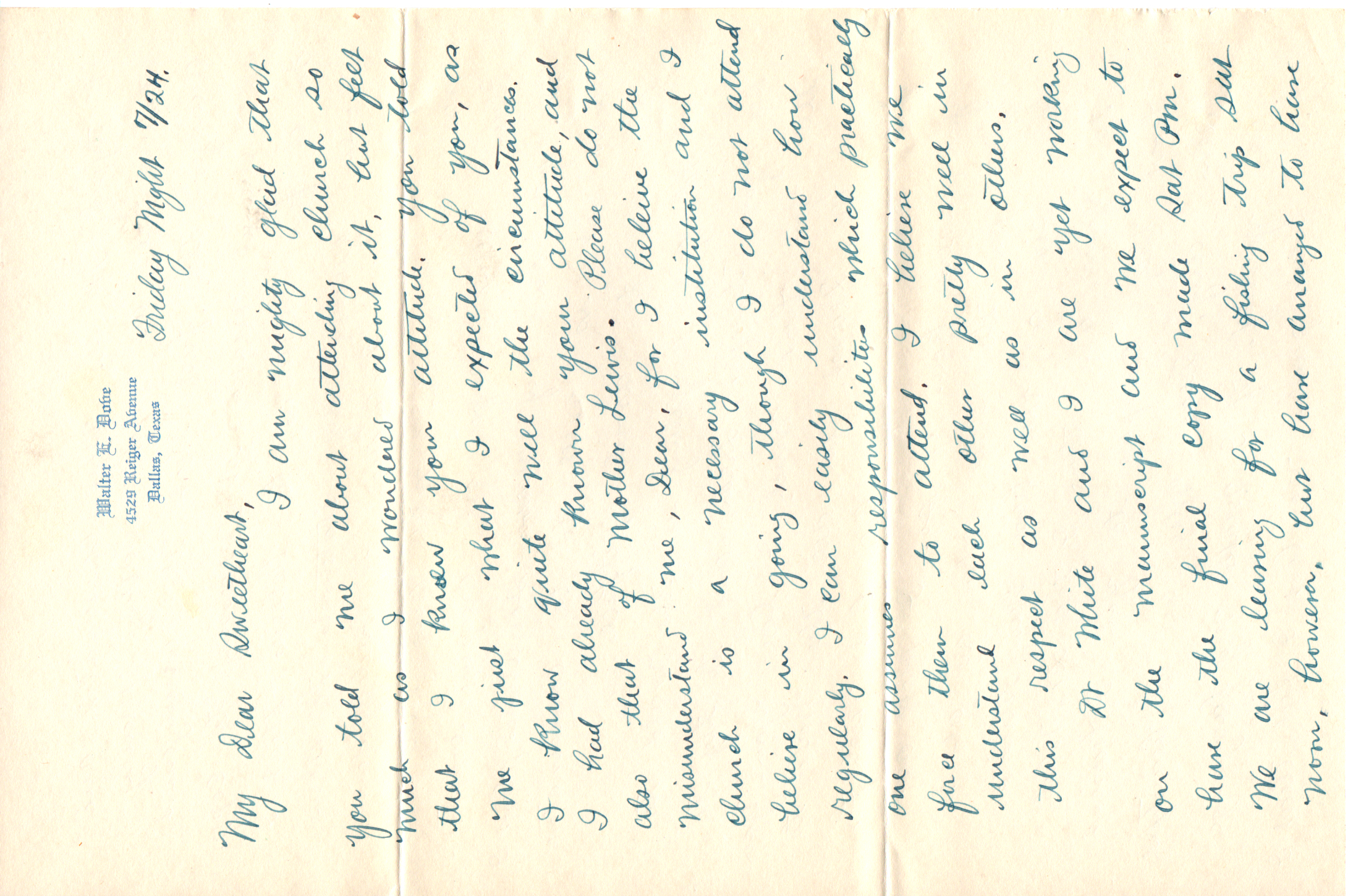 I am mighty glad that you told me about attending church so much as I wondered about it, but felt that I knew your attitude. You told me just what I expected of you, as I know quite well the circumstances. I had already known your attitude, and also that of Mother Lewis. Please do not misunderstand me, Dear, for I believe the Church to be a necessary institution and I believe in going, though I do not attend regularly. I can easily understand how one assumes responsibilities which practically force them to attend. I believe we understand each other pretty well in this respect as well as in others.