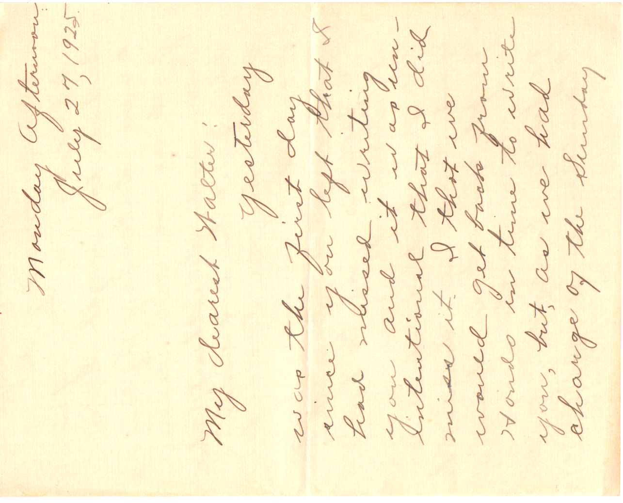 Yesterday was the first day since you left that I had missed writing you and it was unintentional that I did miss it. I thought we would get back from Hondo in time to write you, but, as we had charge of the Sunday evening church hour which lasted until about 9:30, then had quite a time getting our crowd together to come home, we did not arrive in Uvalde until 12:10. So it was no longer Sunday and I waited until later on in the day Monday to write. I love to write you every day when I can, because that is next to receiving a letter from you or being with you. You have been so good to write me even though you were awfully busy, and I surely do appreciate it too. Your Wednesday night letter came Saturday afternoon just as we were leaving town and, Sweetheart, (that’s the first time I ever called anyone that) it was such a nice, long interesting one. It made me feel so good to have it along with me.