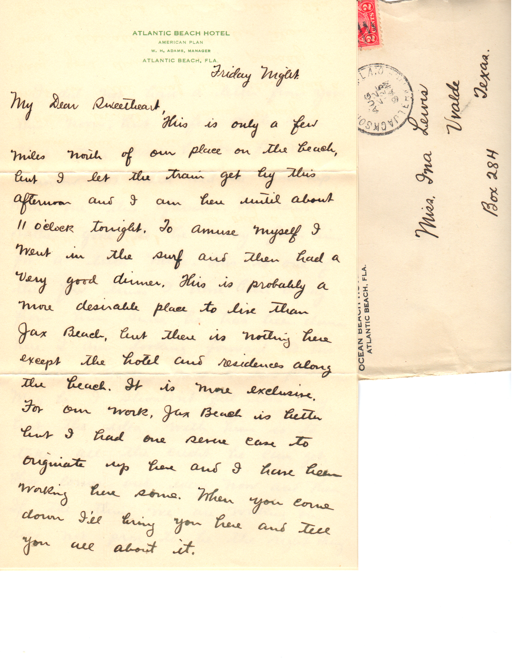 This is only a few miles north of our place on the beach, but I let the train get by this afternoon and I am here until about 11 o’clock tonight. To amuse myself I went in the surf and then had a very good dinner. This is probably a more desirable place to live than Jax Beach, but there is nothing here except the hotel and residences along the beach. It is more exclusive. For our work, Jax Beach is better but I had one severe case to originate up here and I have been working here some. When you come down I’ll bring you here and tell you all about it.