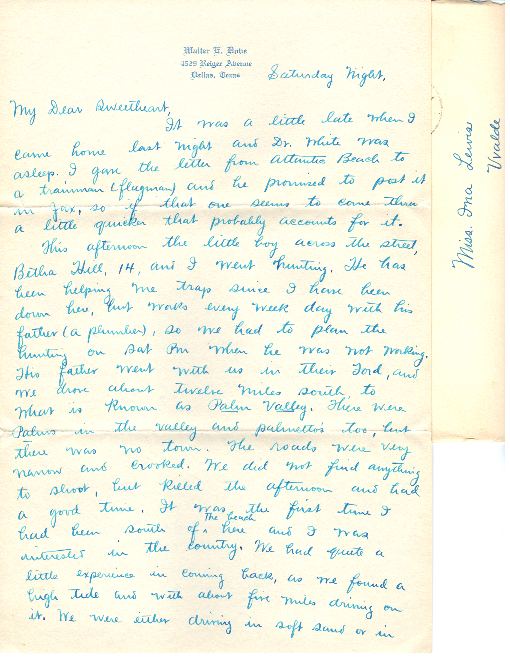 This afternoon the little boy across the street, Betha Hill, 14, and I went hunting. He has been helping me trap since I have been down here, but works every week day with his father (a plumber), so we had to plan the hunting on Sat PM when he was not working. His father went with us in their Ford, and we drove about twelve miles south, to what is known as Palm Valley. There were palms in the valley and palmettos too, but there was no town. The roads were very narrow and crooked. We did not find anything to shoot, but killed the afternoon and had a good time. It was the first time I had been south of the beach here and I was interested in the country. We had quite a little experience in coming back, as we found a high tide and with about five miles driving on it. We were either driving in soft sand or in the water. It wasn’t funny, as there was a northeastern wind beginning which carried the water pretty high. At one time it got into the carburetor and killed the engine. It was getting rougher all the time and we felt fortunate that we got off the beach when we did. It is blowing pretty hard now and I have been told that the “North Easternsers” usually continue for 3, 6 or 9 days at about the same speed. Since it is over I am glad that I have had the experience on the beach during a high tide as I will be cautious when you are with me. It is hardly possible that a person could drown as the water is not deep, but it would be disagreeable to experience. Besides, you might get your “Sunday dress” wet with salt water. (Remember what Thelma Lee said about my “good pants” when you and I were caught in the rain).