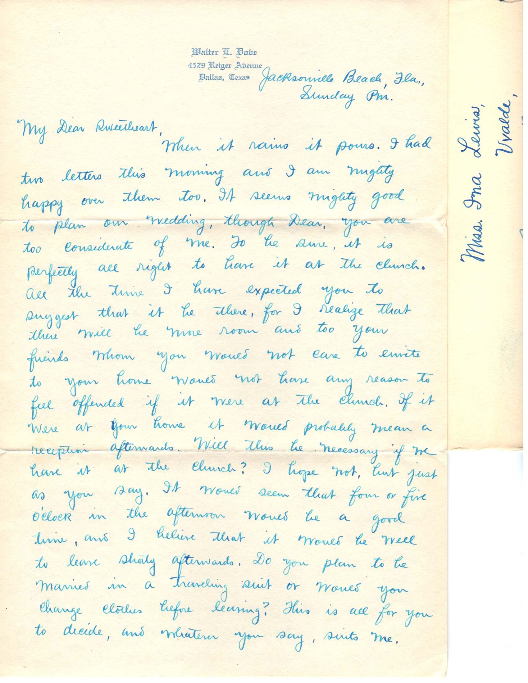 I wish that I knew at this time whether we would come direct to Florida or whether we would live in Dallas before coming. I’d rather come down here and perhaps we could spend a little while in Dallas before coming. If we stay in Dallas for a while perhaps it would be well to have the honeymoon before going there, as we would meet quite a few people while there and I’d rather see them after we have been together more.